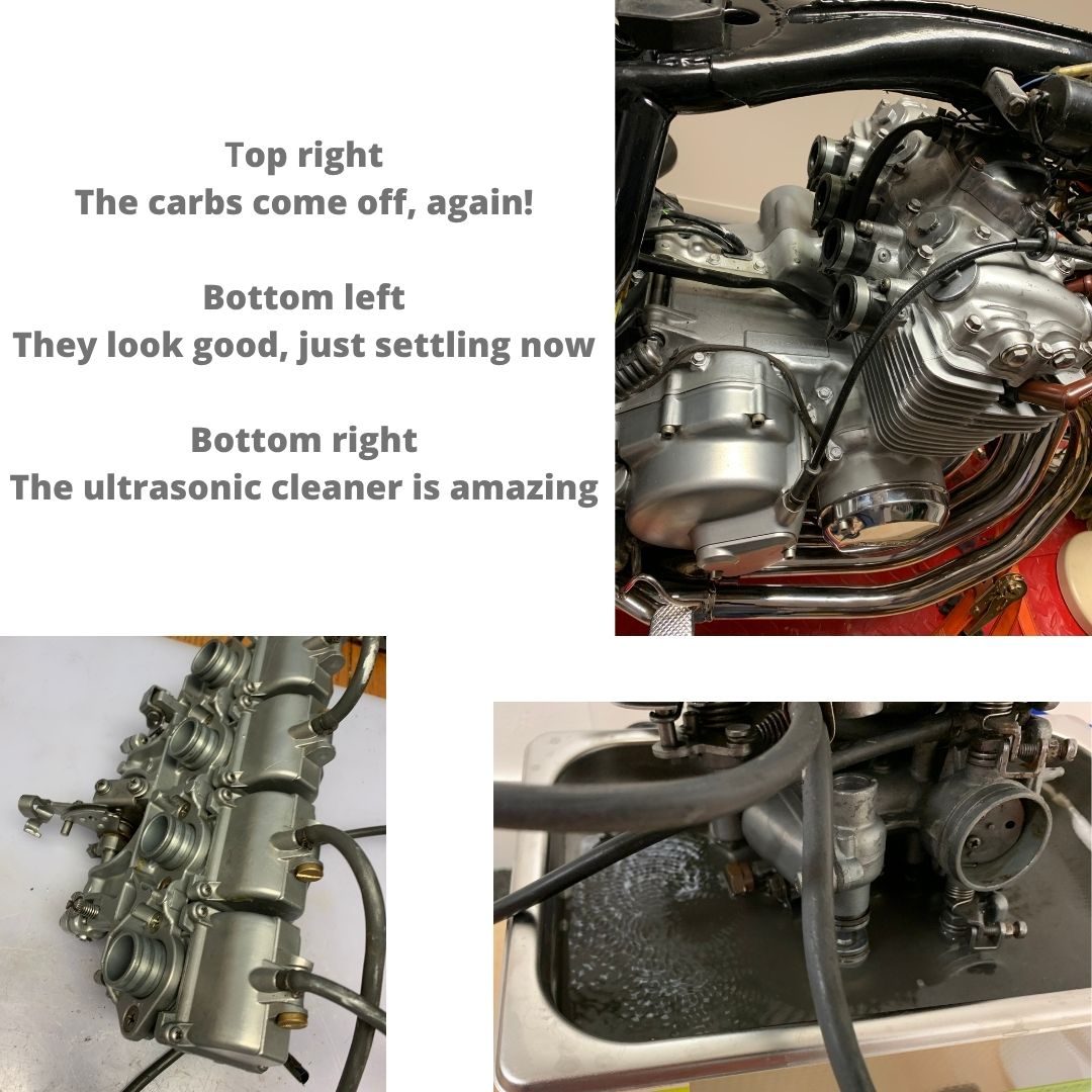 Recent work to Vanquish our lovely Honda CB400/4 was to fix the leaky carbs, after a lot of thinking and not an inconsiderable amount of doing we managed to get them sealed, The ultrasonic cleaner was used to make sure the stop valves were fully clean and operational, then we took our time to change one thing at a time to establish the cause, the floats were not turning off the inlets as it turned out. We finished where the floats are still too low and closing the fuel off too early so we are back onto them next week for the final tune. A good day if not a bit frustrating but we learnt so much!