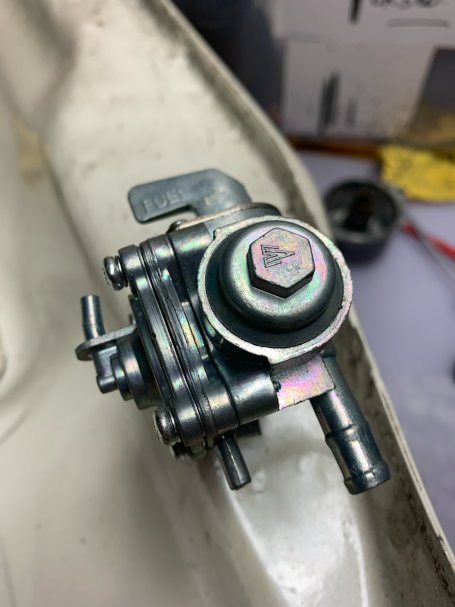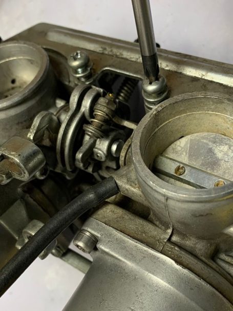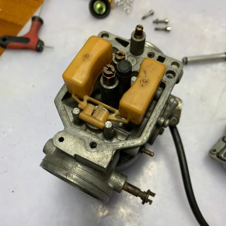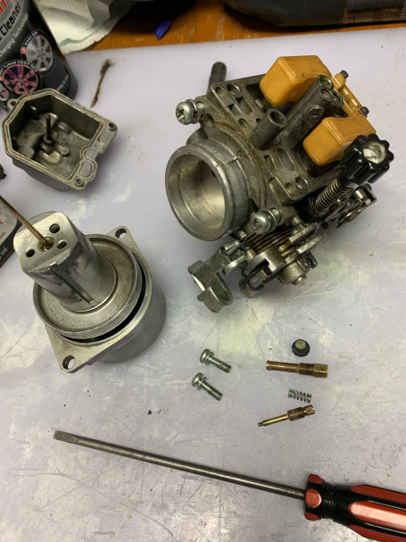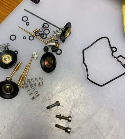 The airbox was reluctant to come out but was "persuaded" shall we say, the petcock was bought to fit but is slightly different, we will see how that goes and the carbs come apart where we find a sticky mess. Trying to get them back together again is no easy matter but we have a spare set for guidance.