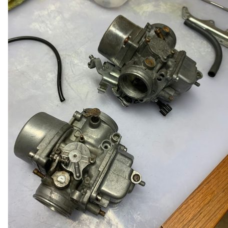 We get to work on the CX500 Eurosport and the carbs are, in a word ... shocking! The bike has a good spark so were half way there but these vacuum carbs are proving to be completely gummed up with what must be years of neglect. A carb gasket set has been acquired but the carbs are simply clogged to within an inch of their lives! I am not sure we can clean them, after days in the ultrasonic we will soon find out whether it is repair or replace!